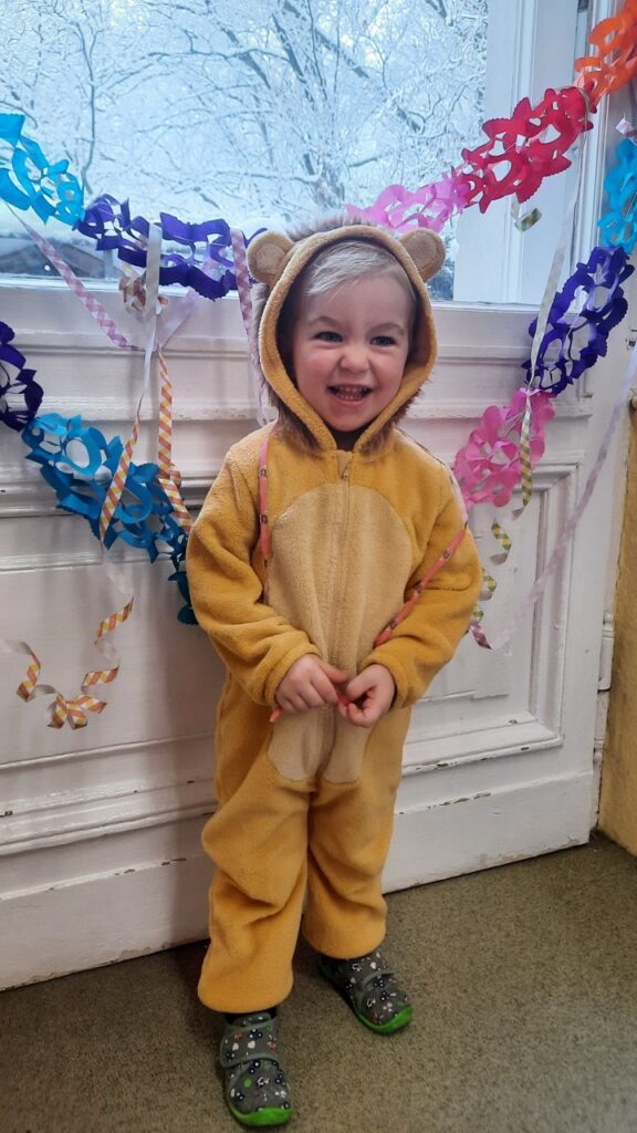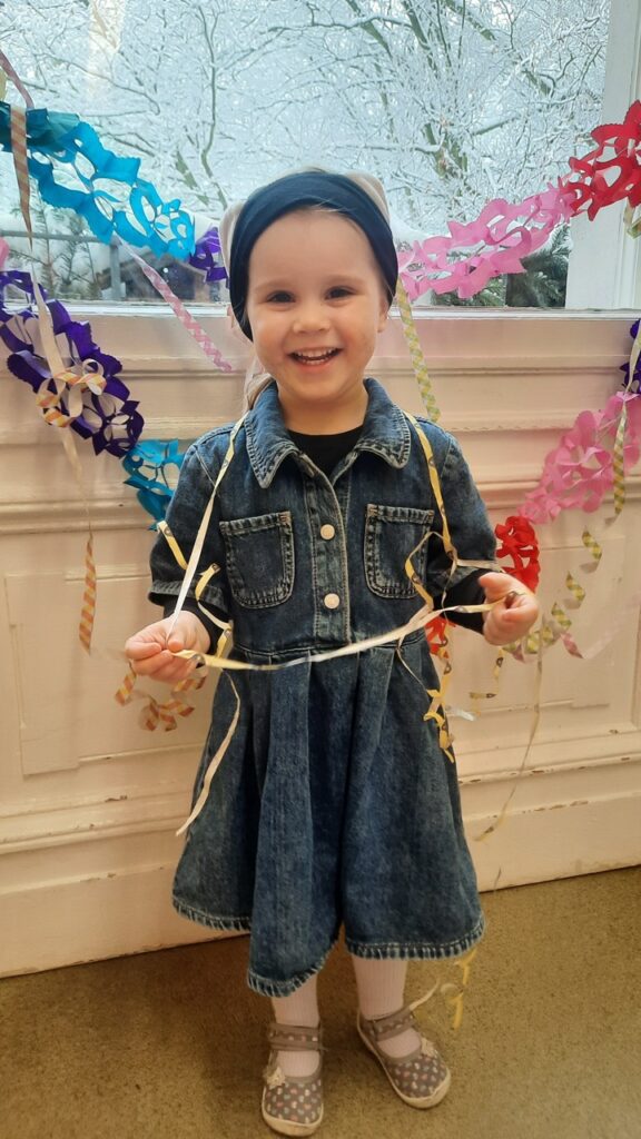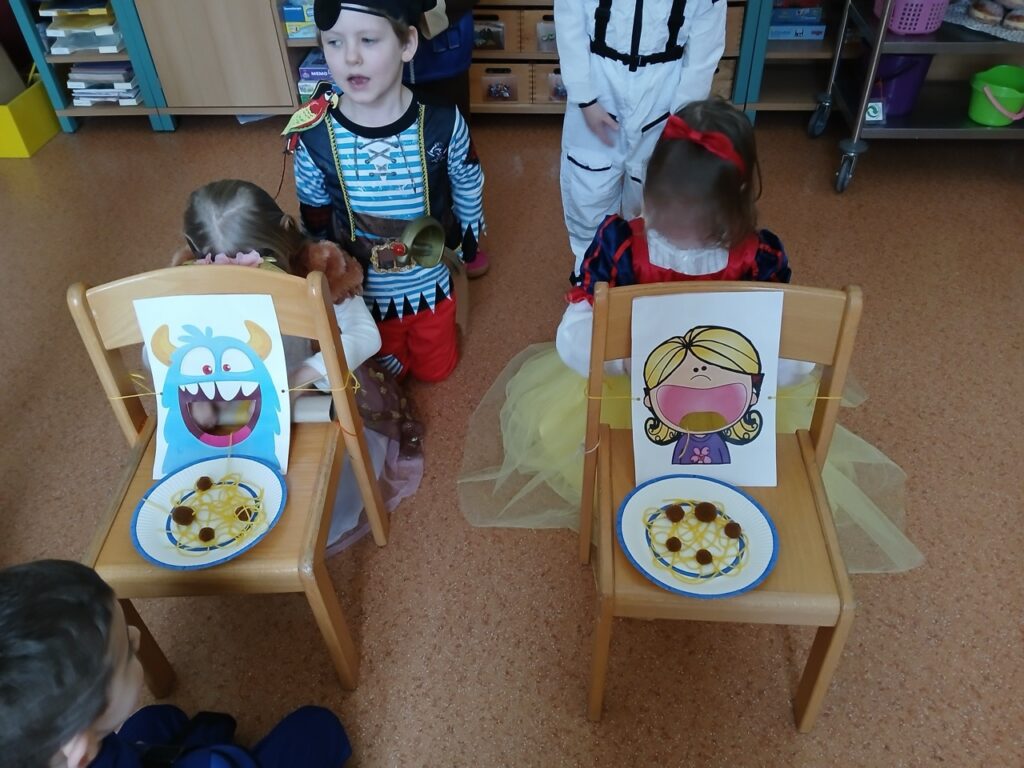 Auch im Kindergarten gab es wieder viel zu erleben, denn dieser verwandelte sich in eine „Villa Kunterbunt“. Nach dem gemütlichen Frühstück, trafen sich alle Kinder und Erzieher in unserer großen Diele zum gemeinsamen Eröffnungstanz: „Wir haben oben gute Laune, unten gute Laune …“ tönte es durchs Kinderhaus.