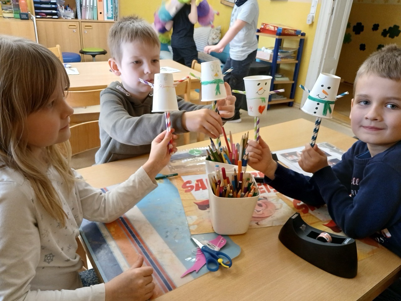 Der Donnerstag war kreativ, denn die Hortkinder hatten sich Winter-Basteln gewünscht. So entstanden u.a. lustige Schneemänner und wollige Vögel.